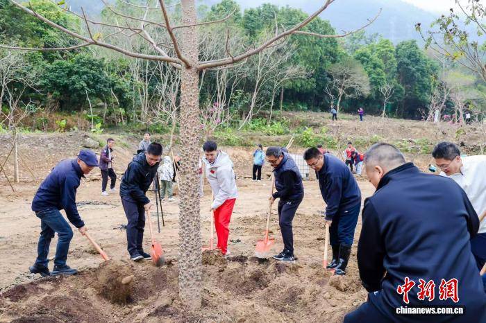 植树现场,陈艾森与参与者们迅速分组协作,挥锹铲土、扶苗定根、踩实培土、浇水灌溉,共种下木棉、火焰木、凤凰木、铁冬青、人面子等乔木以及茶花等灌木共300余株。